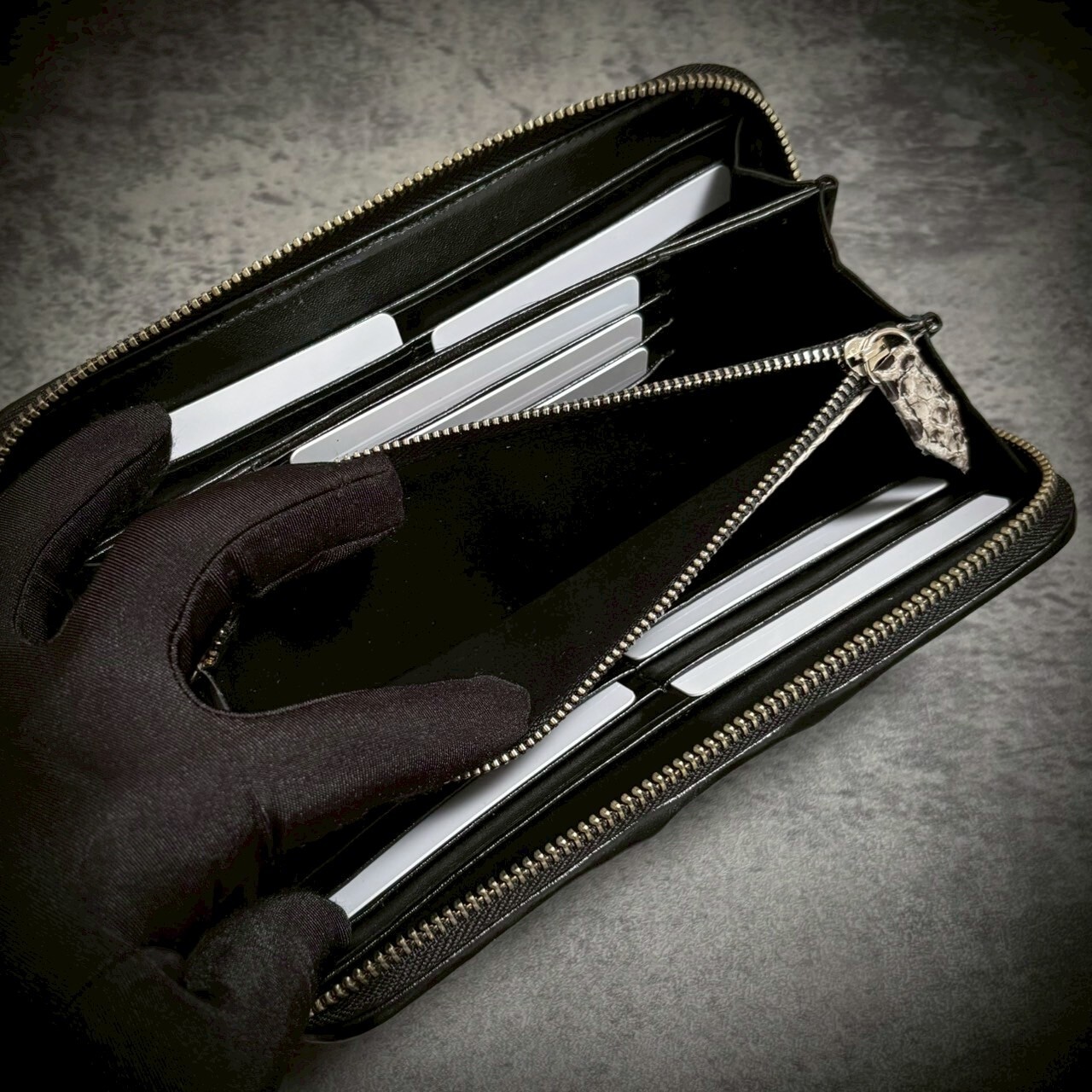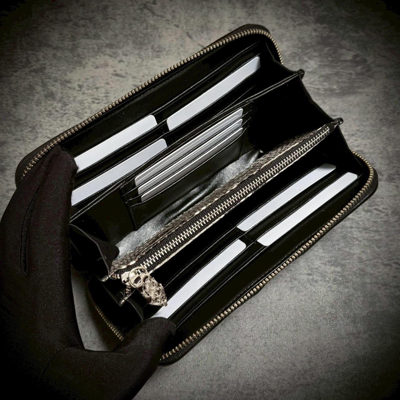 この一枚革の長財布は、贅沢なクロコダイルとパイソンの組み合わせで、存在感抜群。