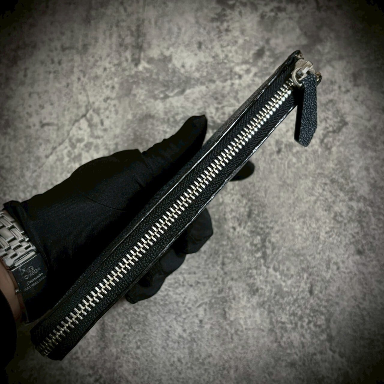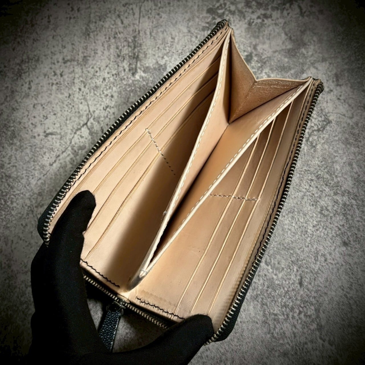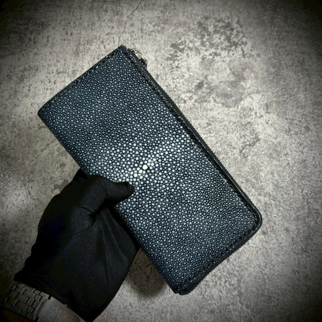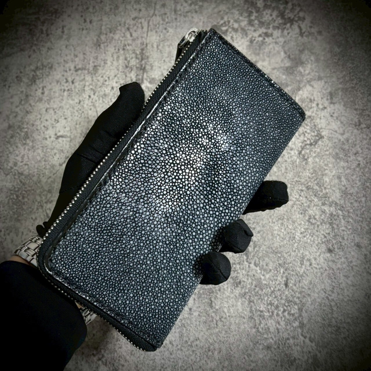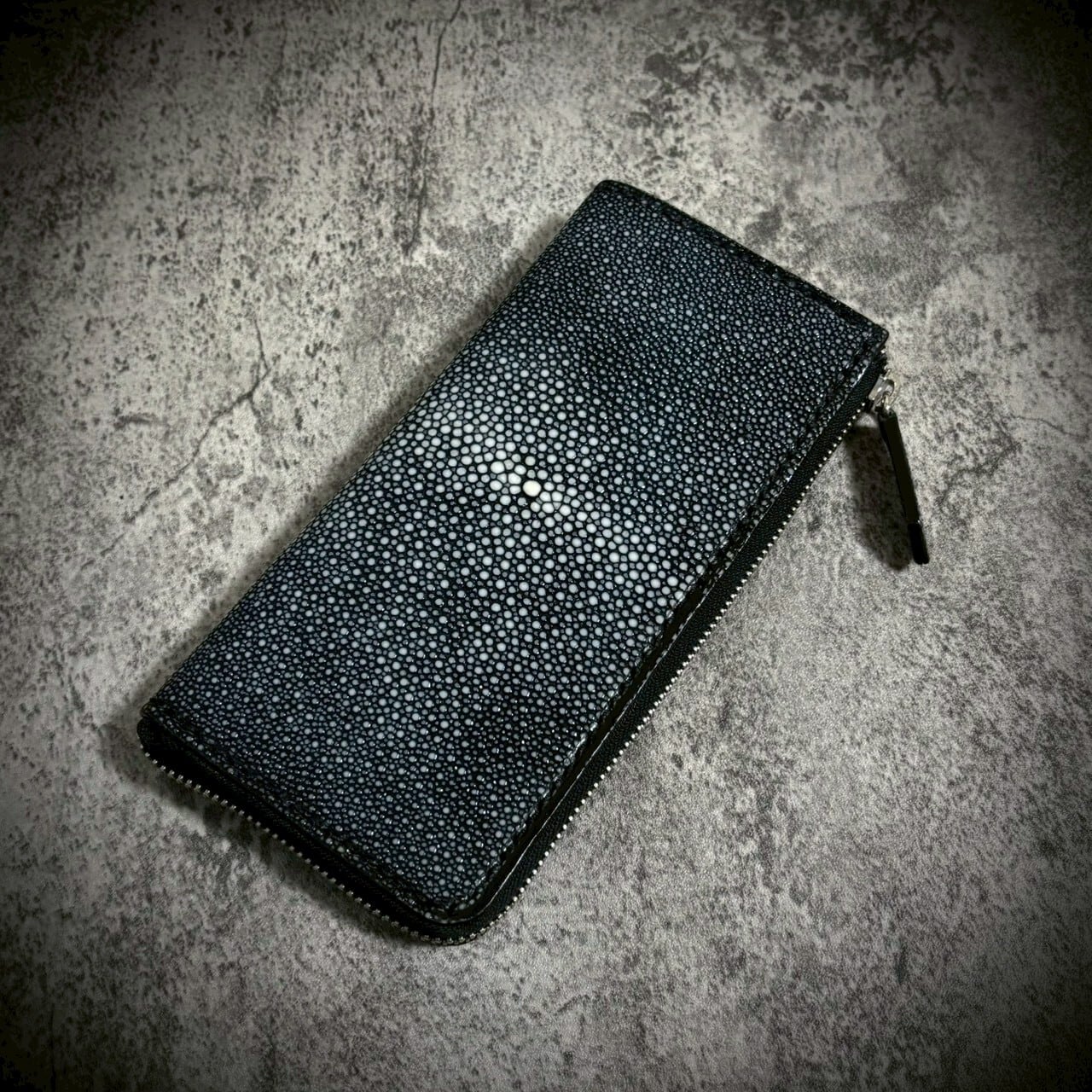 この財布は、スティングレイ一枚革を贅沢に使用し、総手縫いで仕立てたL字ファスナー長財布。素材の存在感を最大限に引き出すため、継ぎのない一枚革を選びました。
