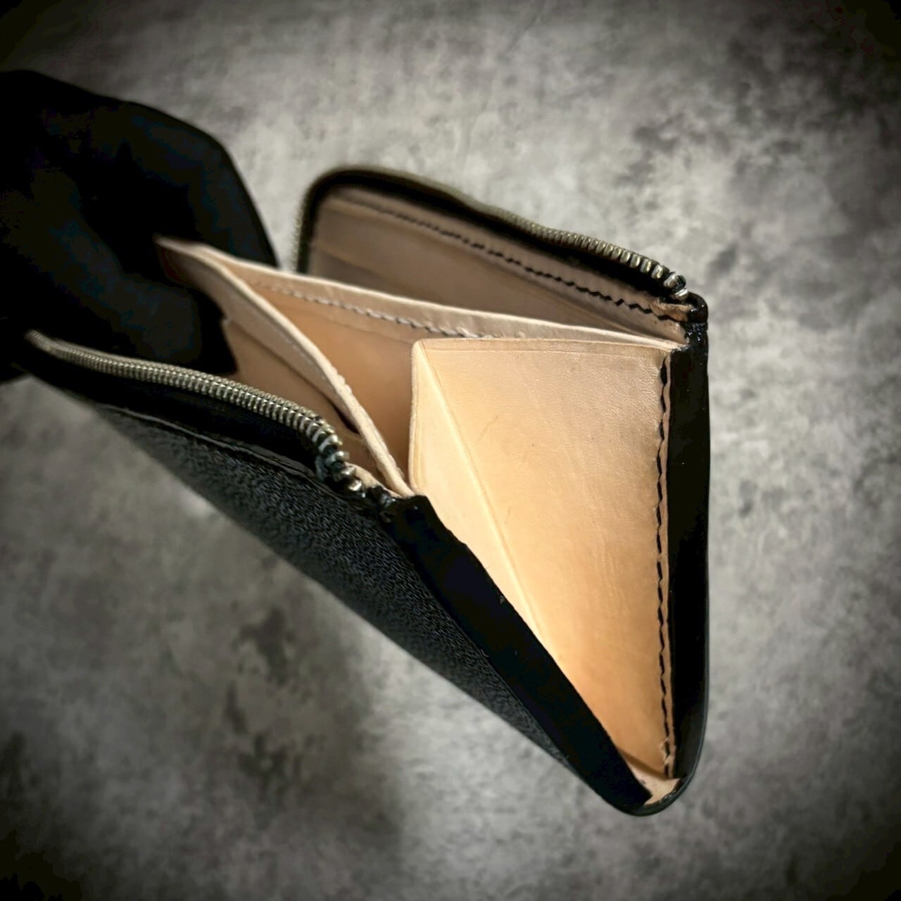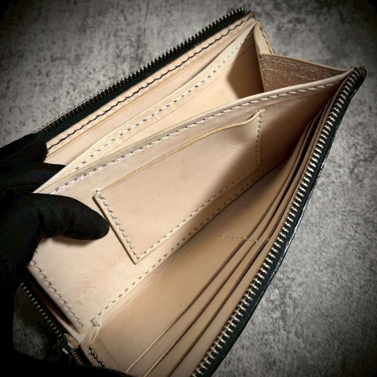 革自体が非常に硬く、加工難易度が高いため、扱える職人は限られます。だからこそ、完成した財布には“本物”だけが持つ重厚感があります。