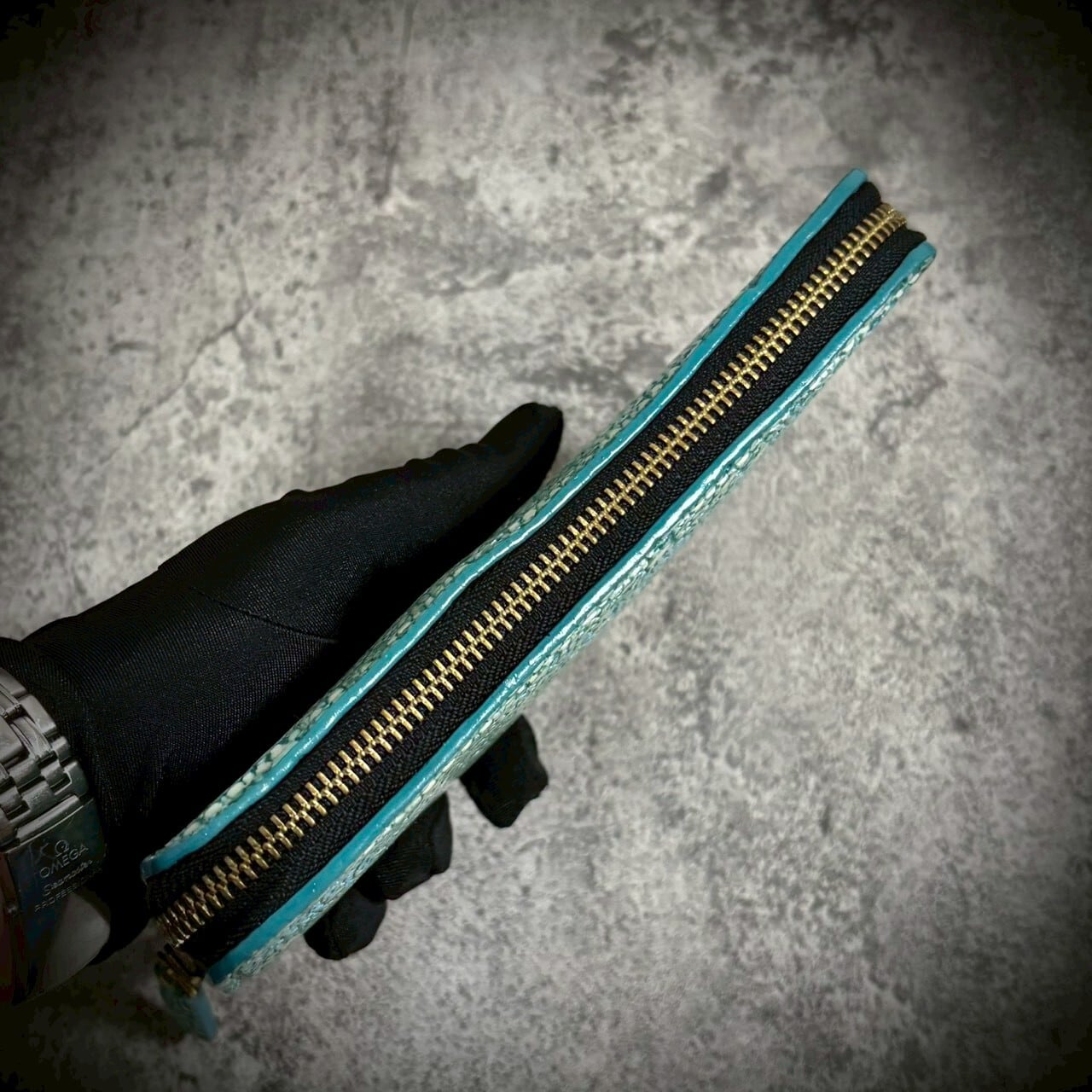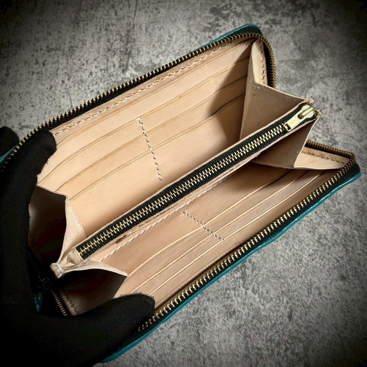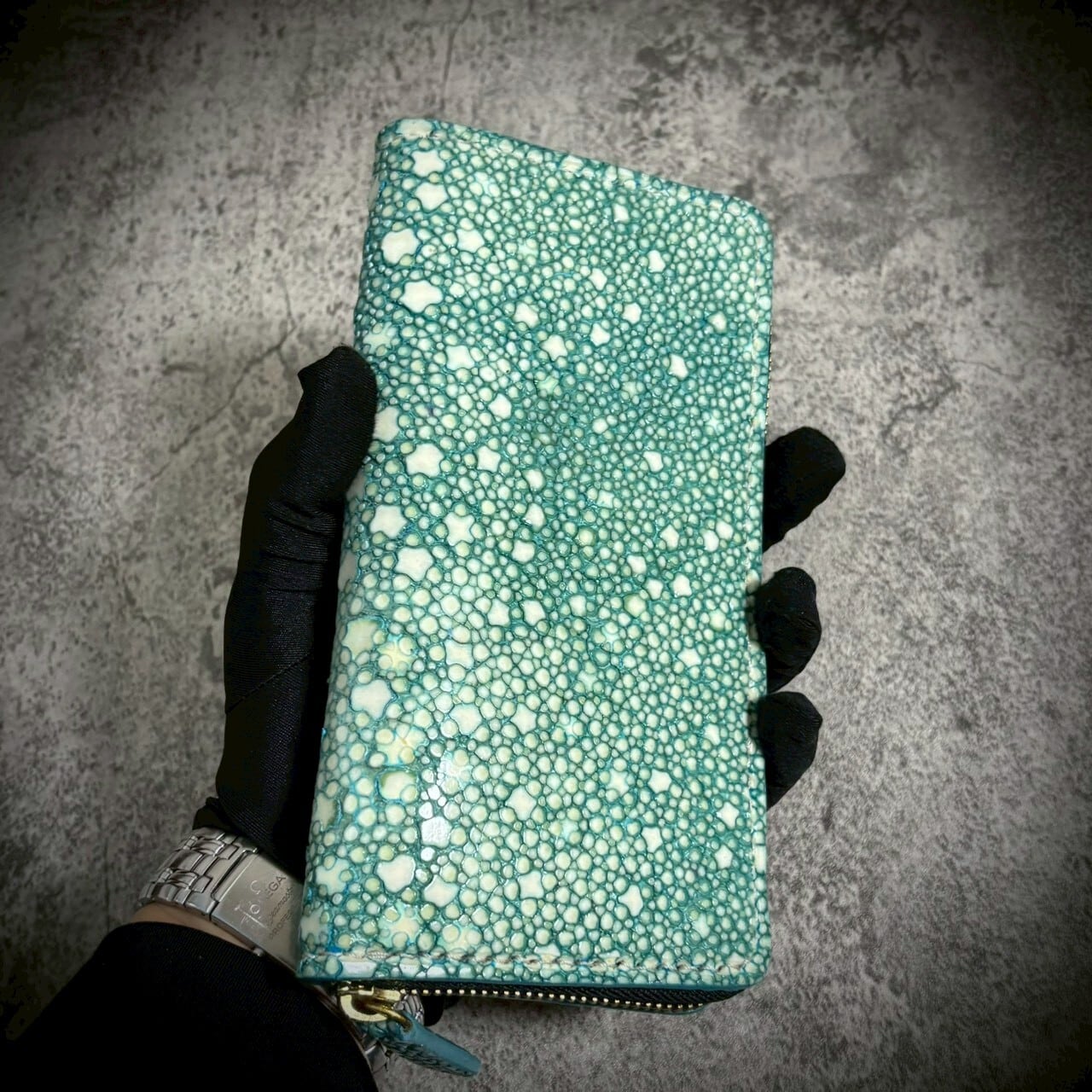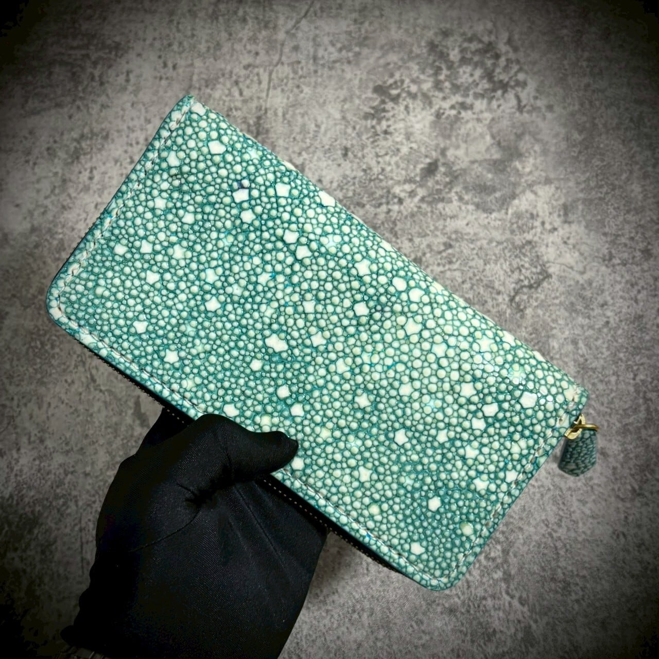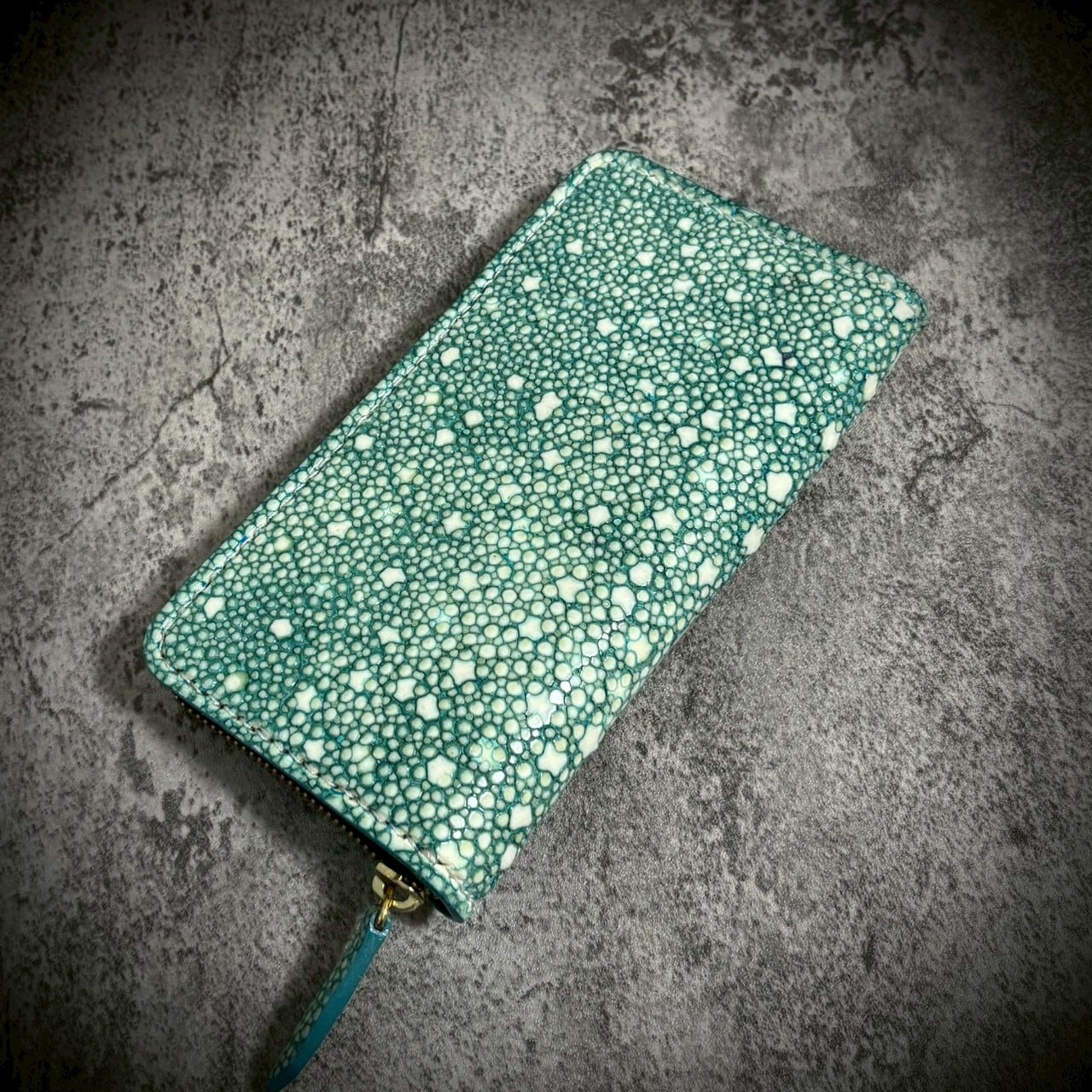 スタースティングレイ 総手縫い 長財布 カイラギ エイ革 一枚革 ガルーシャ 梅花皮 スティングレイ ハンドメイド 大容量 ターコイズブルー メンズ レディース プレゼント ギフト ラッピング