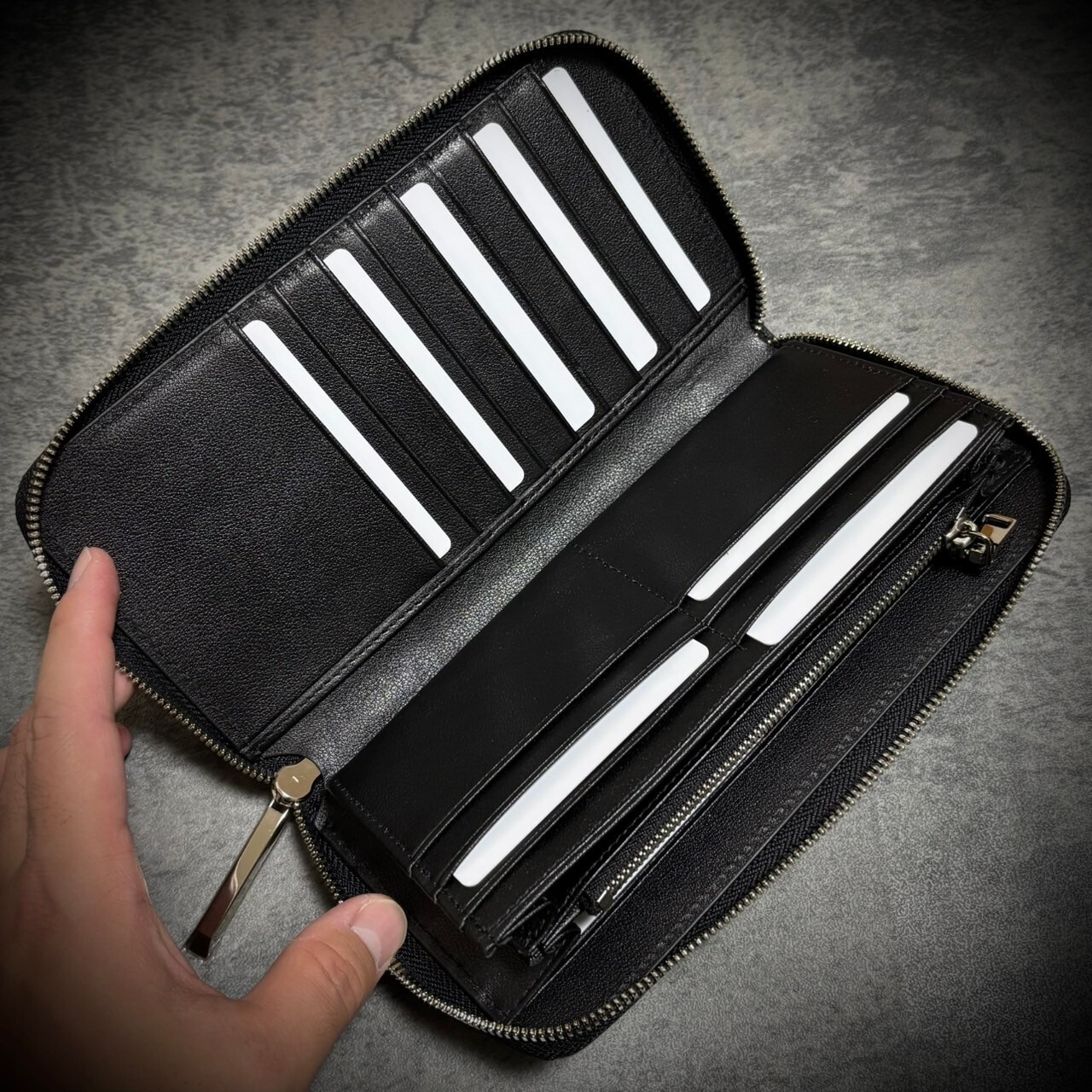 内面の素材は牛革のソフトレザーを使用。柔らかくて使いやすいです。中身が見やすく収納力が抜群です。