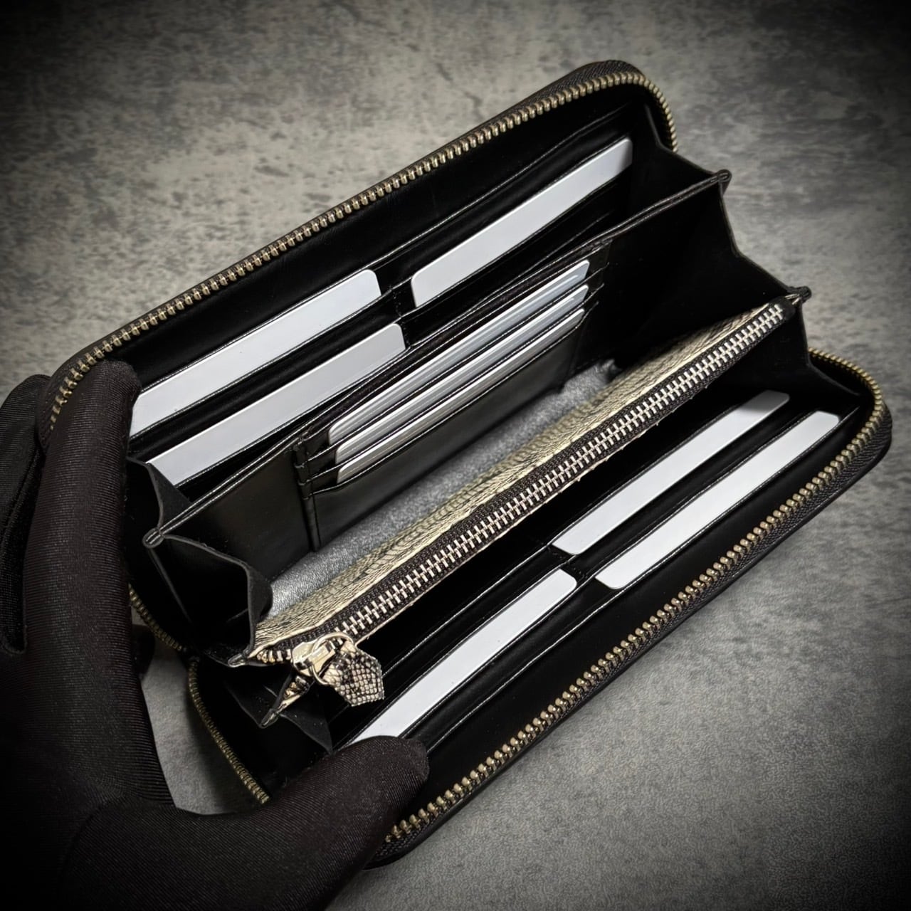 この一枚革の長財布は、贅沢なクロコダイルとパイソンの組み合わせで、存在感抜群。