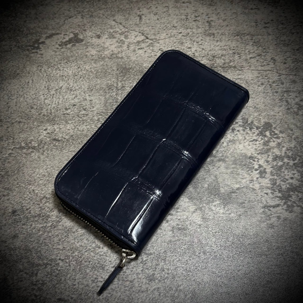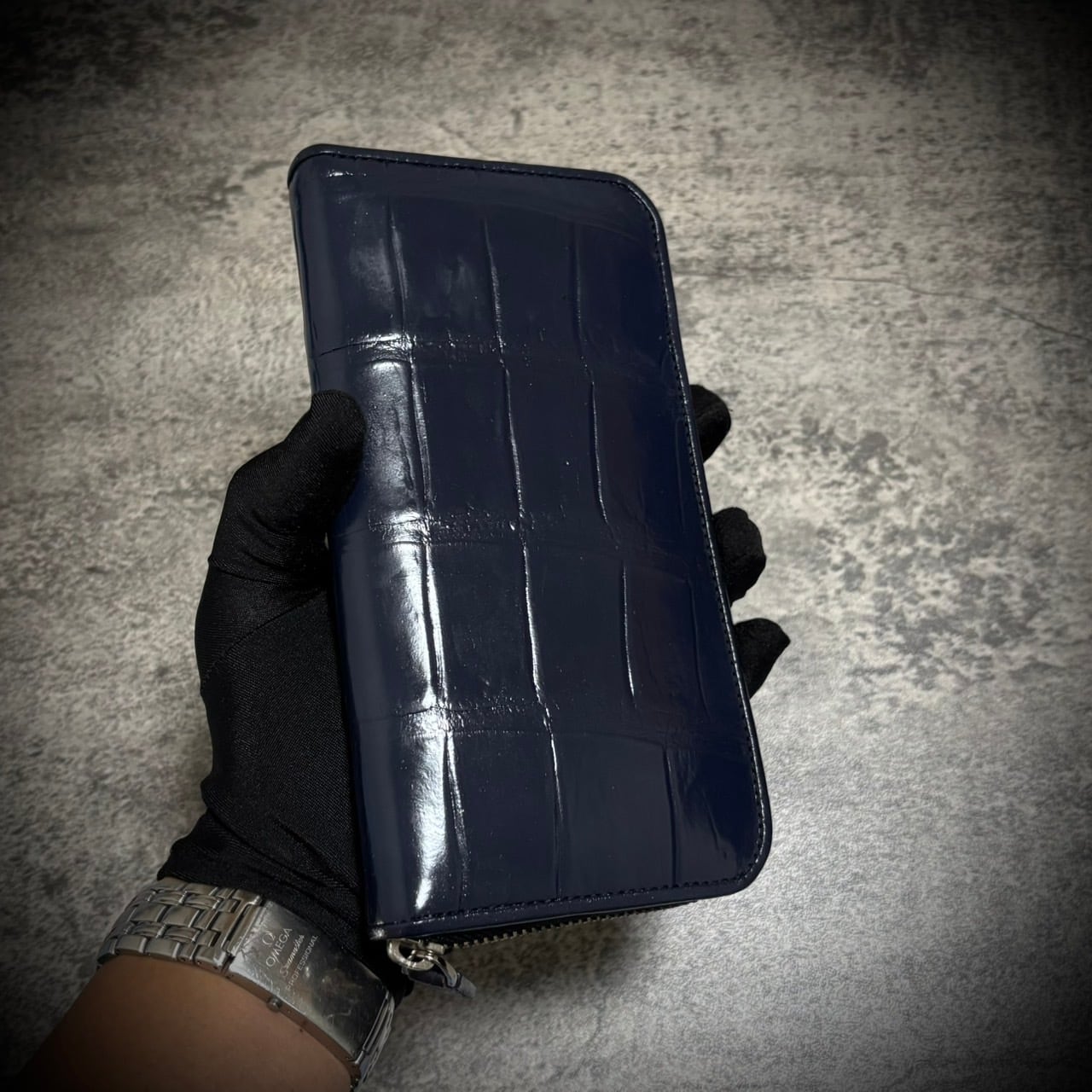 クロコダイル × パイソン メンズ財布 長財布 シャイニング加工 一枚革 カード15枚収納 ネイビー 紺