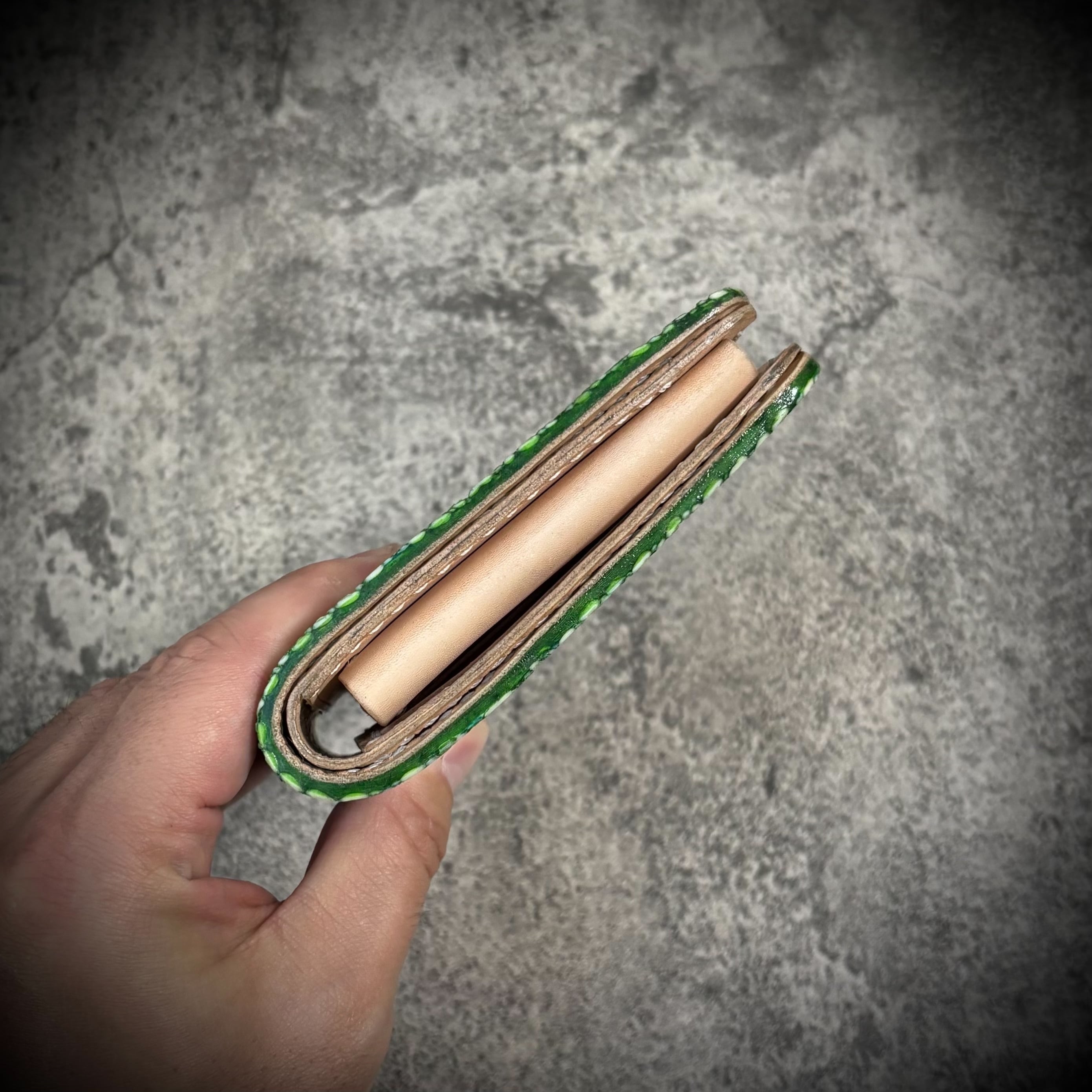 本商品はそのスタースティングレイを総手縫い一枚革で仕上げたハーフウォレットです。