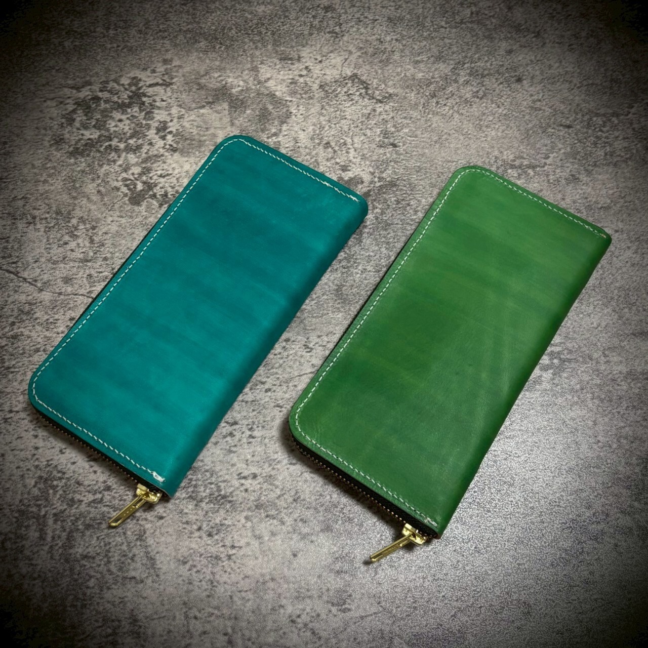 植物タンニンがしっかり通った革を手染めでムラ染めしました。