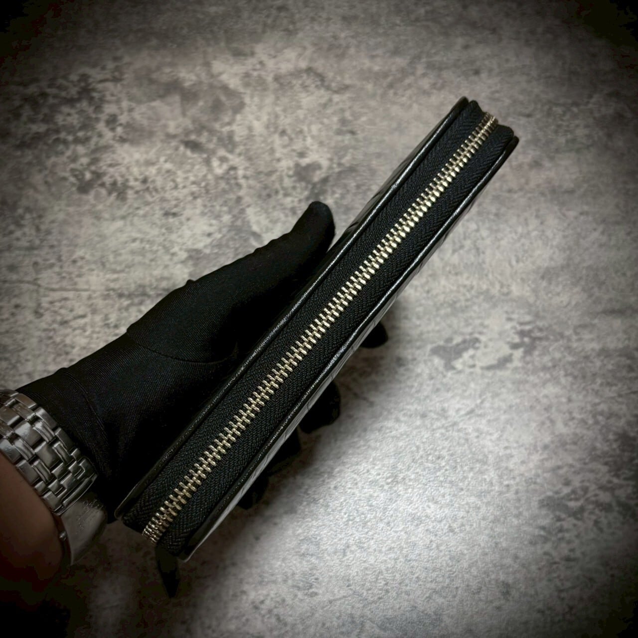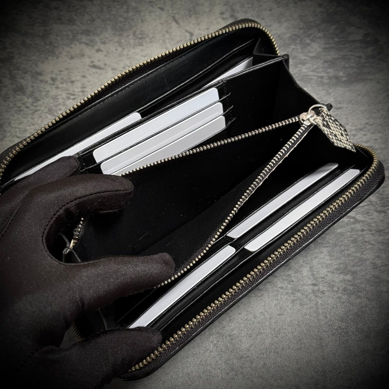 この一枚革の長財布は、贅沢なクロコダイルとパイソンの組み合わせで、存在感抜群。