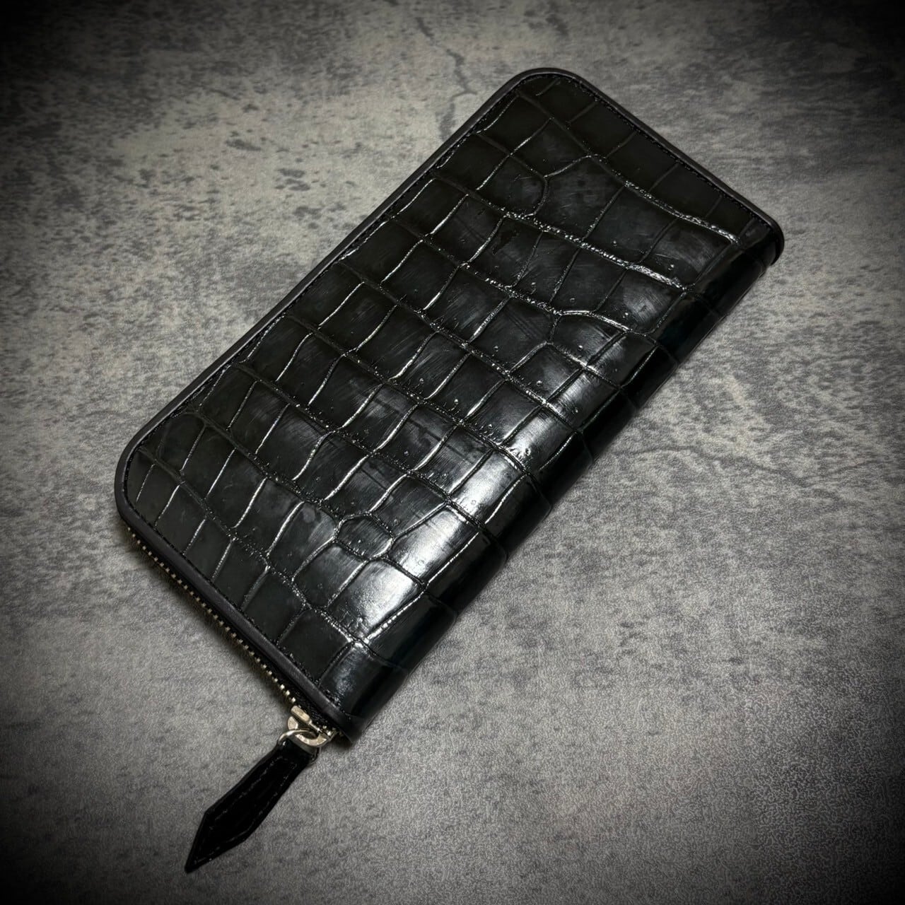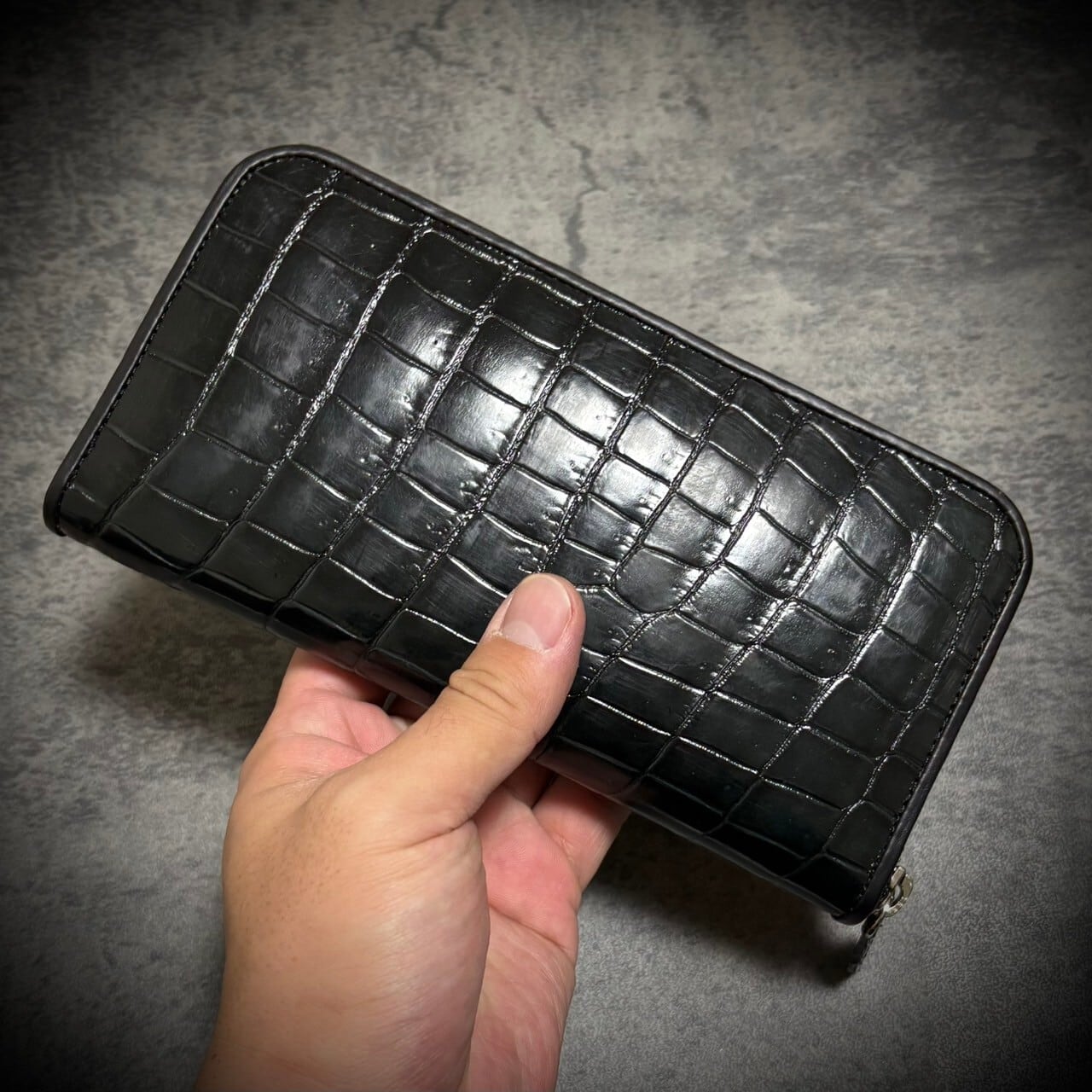 クロコダイル × パイソン メンズ財布 長財布 シャイニング加工 一枚革 カード15枚収納 ブラック 黒