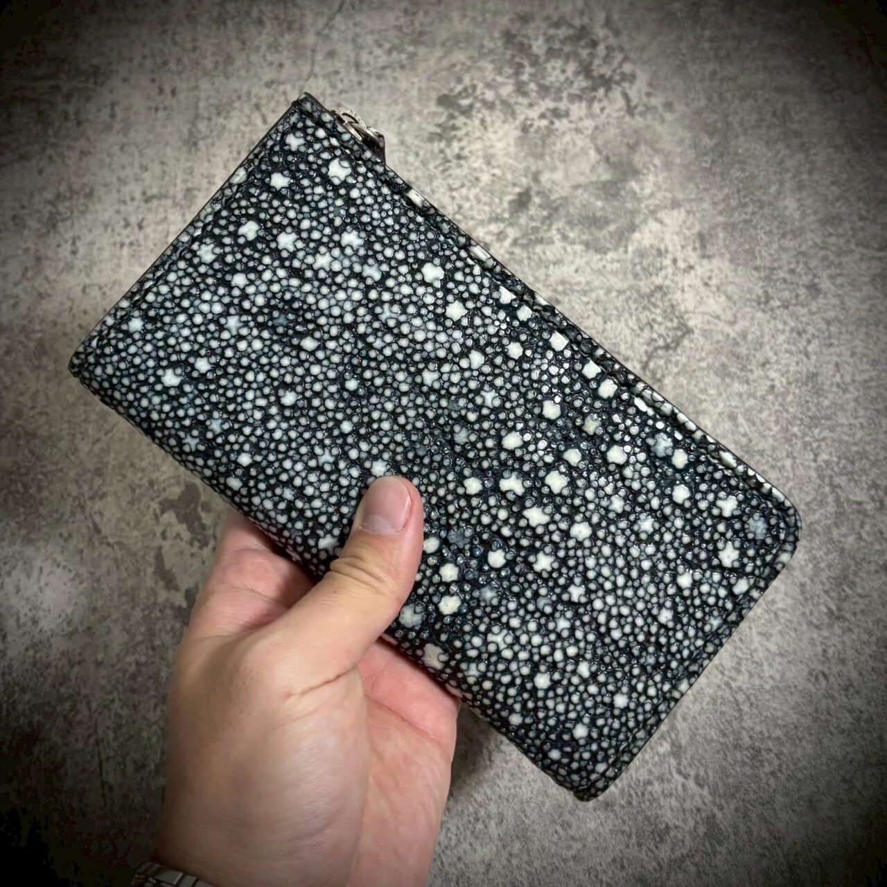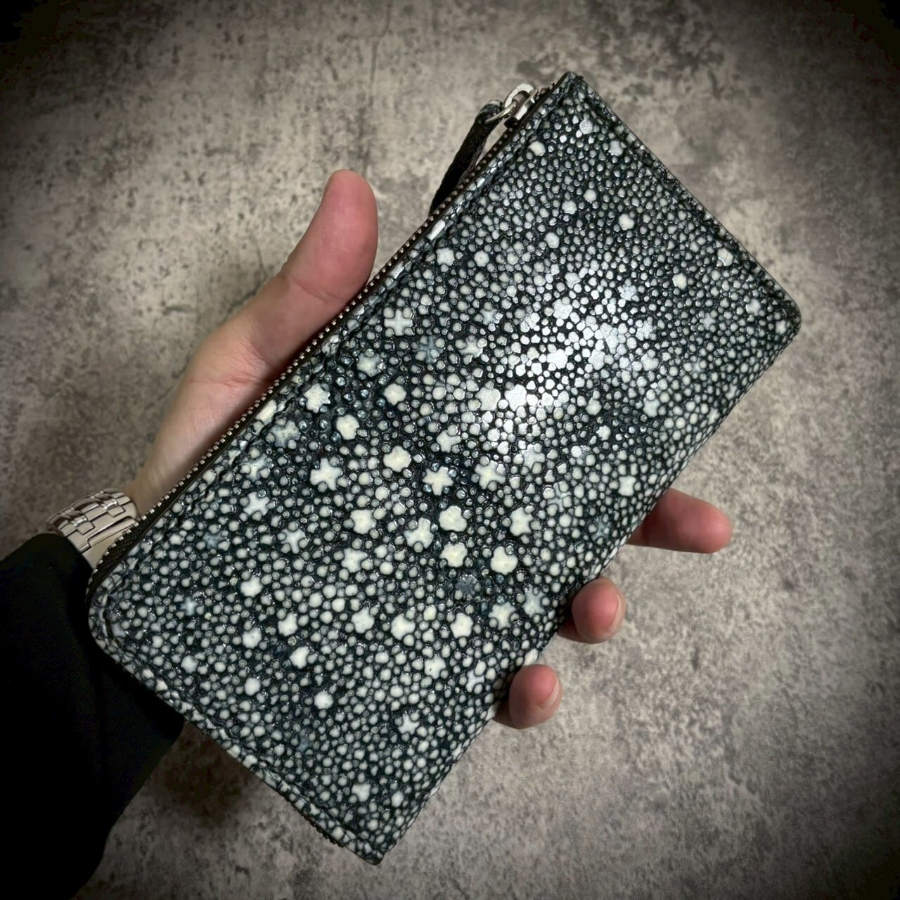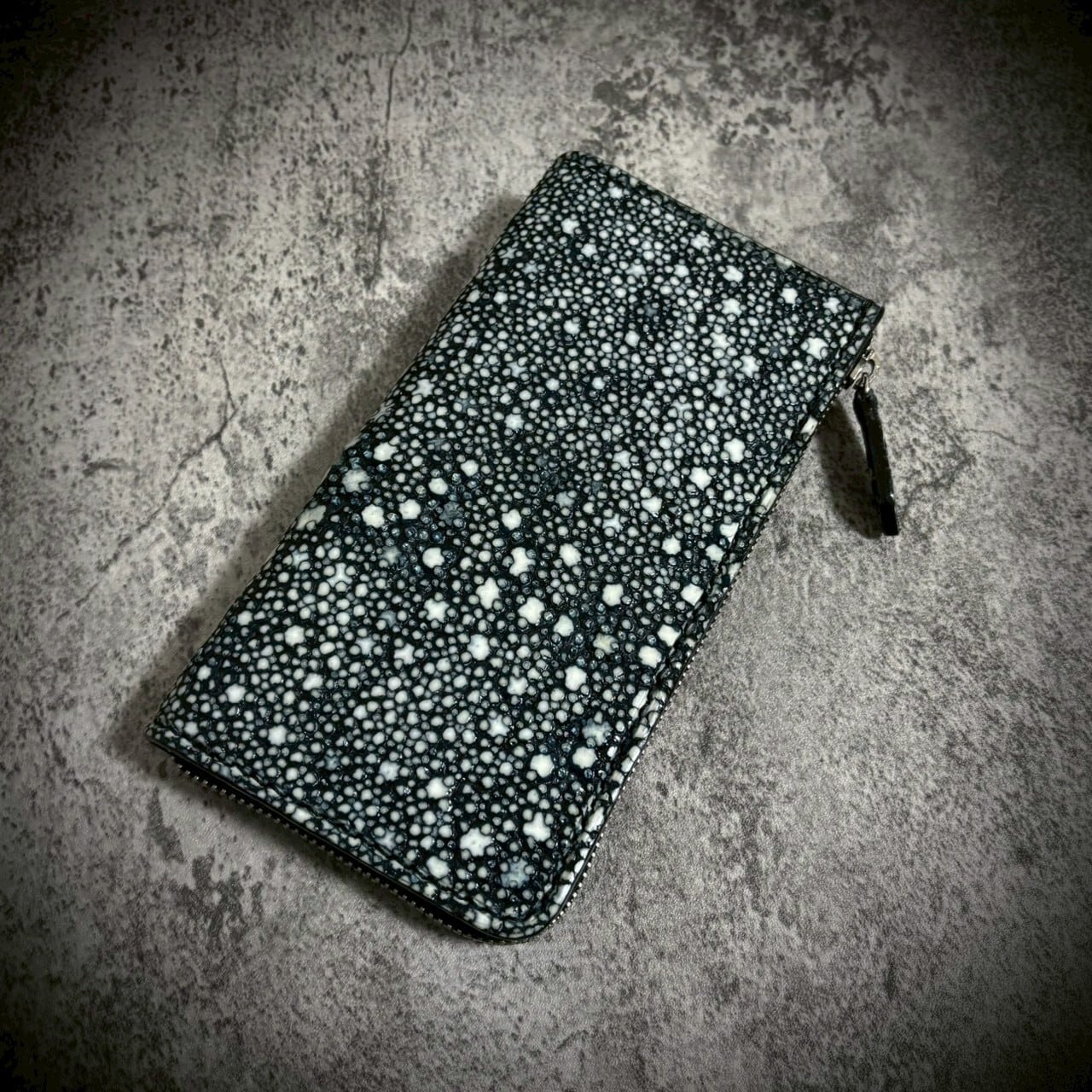 この財布は、スタースティングレイ一枚革を使用し、総手縫いで仕立てたL字ファスナー長財布。一切の妥協なく、素材の存在感を最大限に引き出すため、継ぎのない一枚革を選びました。