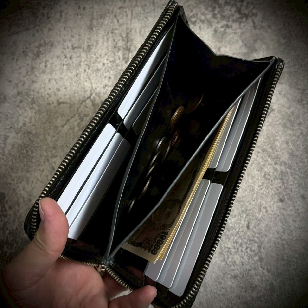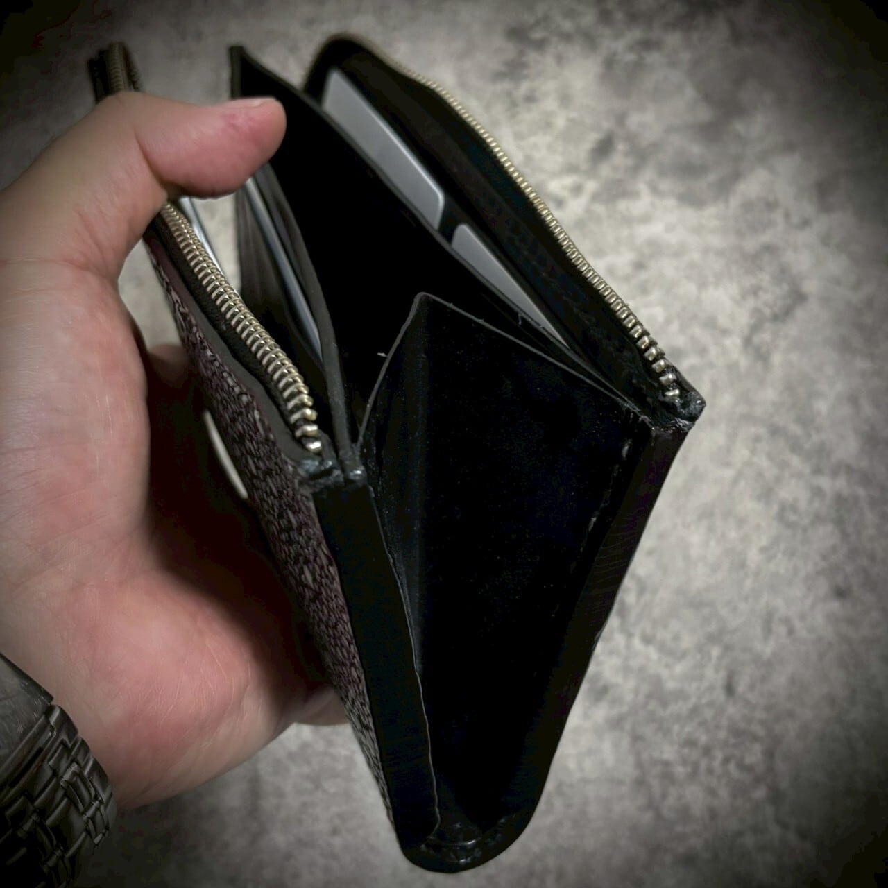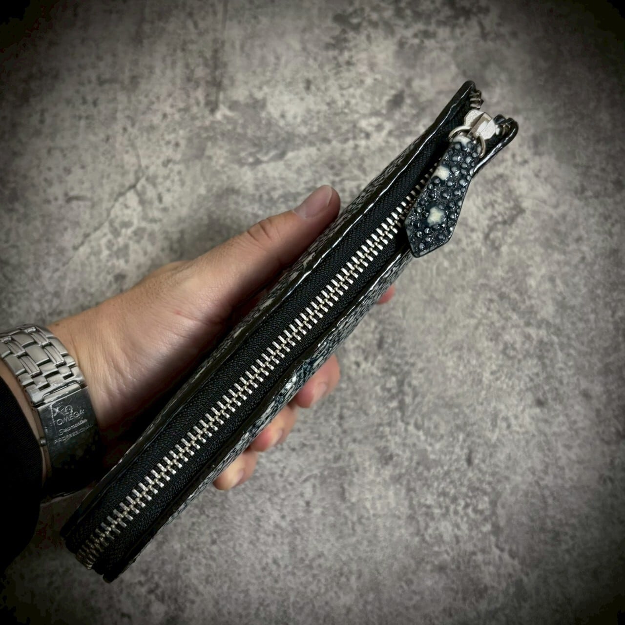 この財布は、スタースティングレイ一枚革を使用し、総手縫いで仕立てたL字ファスナー長財布。一切の妥協なく、素材の存在感を最大限に引き出すため、継ぎのない一枚革を選びました。