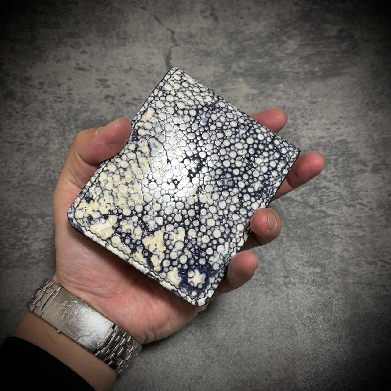 スタースティングレイ 二つ折り 財布 総手縫い 梅花皮 折財布 ガルーシャ カイラギ 超希少 革財布 経年変化 ネイビー 紺 ハンドメイド 海の宝石 プレゼント ギフト