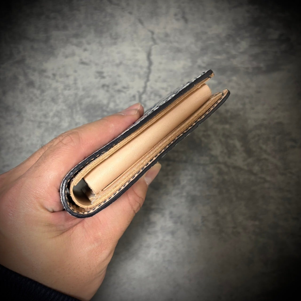 本商品はそのスタースティングレイを総手縫い一枚革で仕上げたハーフウォレットです。